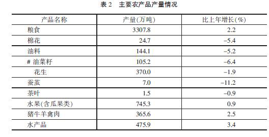 农业生产提质增效。加快推进农业现代化工程,大力发展现代高效农业,农业综合生产能力稳步提高。粮食连续八年增产,全年总产量达3307.8万吨,比上年增产72.7万吨,增长2.2%。其中,夏粮1117.2万吨,增长1.1%;秋粮2190.6万吨,增长2.9%。全年粮食面积531.9万公顷,比上年增加3.7万公顷;棉花面积23.9万公顷,增加0.4万公顷;油料面积55.2万公顷,减少2.2万公顷;蔬菜面积126万公顷,增加3万公顷。高效农业面积增加,新增高效农业面积21万公顷,新增高效渔业面积7.5万公顷,新增设施农业面积9.3万公顷,新增设施渔业面积2.5万公顷。