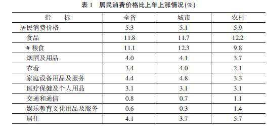 物价调控取得积极成效。保障供应、疏畅流通、加强监管、健全机制,加大价格调节专项资金投入力度,建设平价商店促进农产品产销对接,切实控制物价涨幅,下半年以后物价涨势明显趋缓。全年居民消费价格比上年上涨5.3%,涨幅比上半年回落0.4个百分点。食品价格上涨11.8%。其中,猪肉上涨30.1%、油脂上涨13.7%、鲜蛋上涨15.5%、禽上涨14.4%、鲜菜上涨1.6%。工业生产者出厂价格上涨6.2%,其中纺织业上涨12.4%、化学原料及化学制品业上涨9.5%、医药制造业上涨3.6%、化学纤维制造业上涨11.2%、黑色金属冶炼及压延加工业上涨12.1%、有色金属冶炼及压延加工业上涨11.9%、电气机械及器材制造业上涨5.6%。工业生产者购进价格上涨8.9%。农业生产资料价格上涨12.6%。