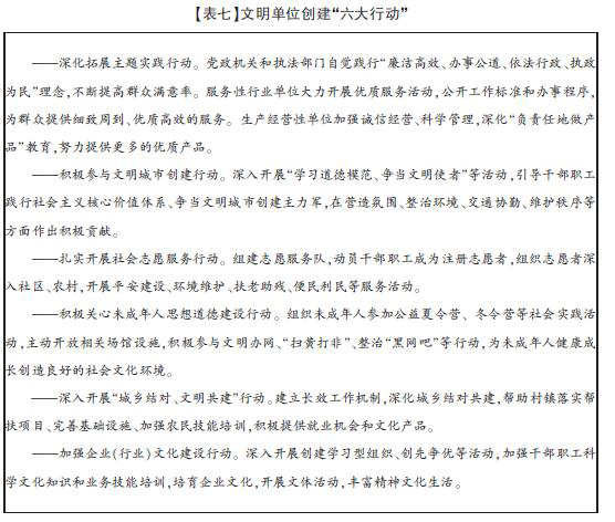 5.深化文明创建活动。深入推进文明城市、文明村镇、文明单位、文明社区、文明集市、文明风景旅游区等创建活动,协调推进城乡文明建设,开展“市民公共文明指数”、“乡风文明指数”和“行业文明服务公众满意度指数”测评,不断提高社会文明程度和群众满意度。继续抓好“百城万店无假货”、“放心消费”等创建活动,引导、推动新经济组织和新社会组织开展创建活动。到2015年,力争创建全国文明城市10个、文明村镇120个、文明单位180个,打造区域文明城市群和文明城镇群。