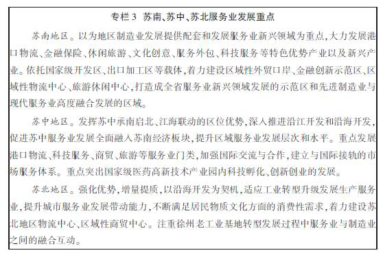 沿沪宁线高新技术产业服务集聚带。该区域以提升产业功能、提高产出效率、增强产业国际竞争力为基本导向,优先发展生产服务业,促进高新技术产业和现代服务业深度融合。重点规划和发展金融、服务外包、信息服务、商务、研发、设计等生产服务业以及空港物流、文化创意、动漫等新兴服务业领域。