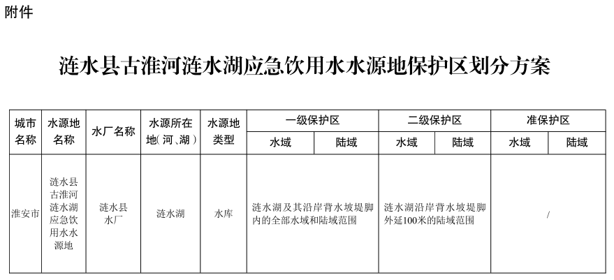 一、原则同意涟水县古淮河涟水湖应急饮用水水源地保护区划分方案。
