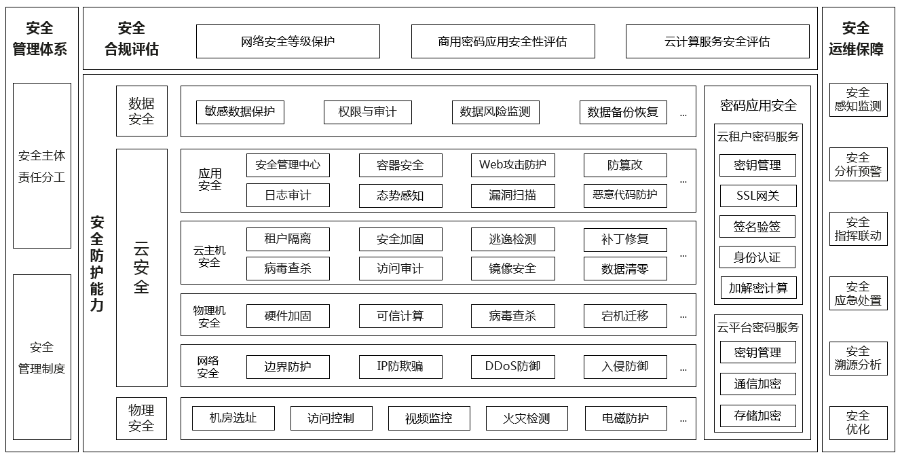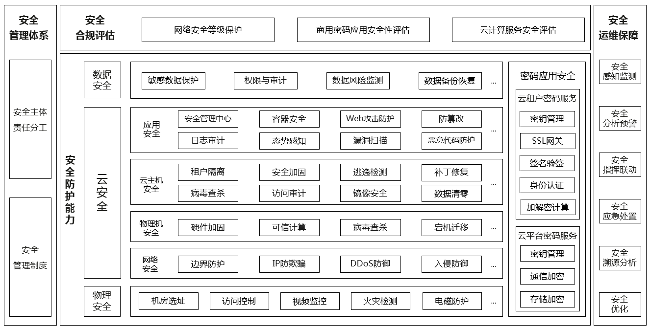 建立健全安全管理体系、主动防护能力、安全合规评估和安全运维保障四位一体的立体纵深安全防护体系,达到管理可执行、技术可落地、合规可监管、安全可运维。