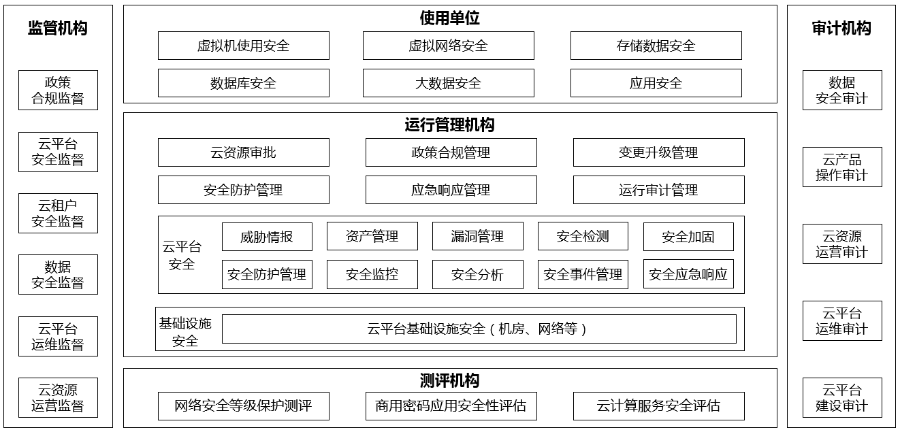 明确安全主体责任分工。针对政务云的运行管理、服务提供、使用、监管和审计等部门单位,确立边界清晰、权责明确的安全管理职责。运行管理机构作为云平台安全责任主体,负责数据中心和云平台的安全保障,落实云平台等级保护、密码应用安全、云服务安全和工作秘密信息管理等要求,指导和监督使用部门单位开展云上业务应用系统安全相关工作。使用部门单位作为上云业务应用系统的安全责任主体,负责本部门单位云上业务应用系统和数据的安全管理工作,落实业务应用系统等级保护、密码应用安全和工作秘密信息管理等要求,常态化开展安全自评自查自纠。监管机构和审计机构依据相关法律法规,对云平台及云上业务应用系统相关方的安全工作进行监管和审计。