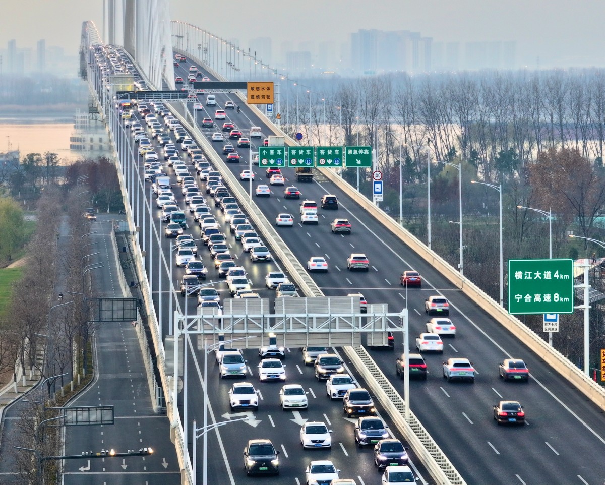 1月3日,南京江心洲长江大桥迎来假期返程高峰。南京交警启用远程智慧管控,通过导航App推送路况预警,引导车辆分流至其他过江通道,全力保障返程高峰通行秩序。 范俊彦 摄