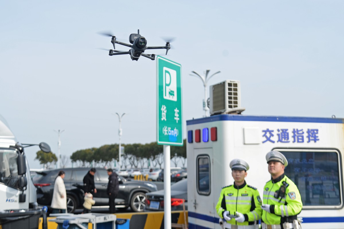 2月23日,春运返程高峰,沪武高速滆湖段车流密集,常州市公安局交管支队高速二大队多措并举,全力保障道路安全畅通。大队强化空地联动,联合高速管理处启用无人机巡查,实时监测路况并通过高空喊话引导车流。夏晨希 摄