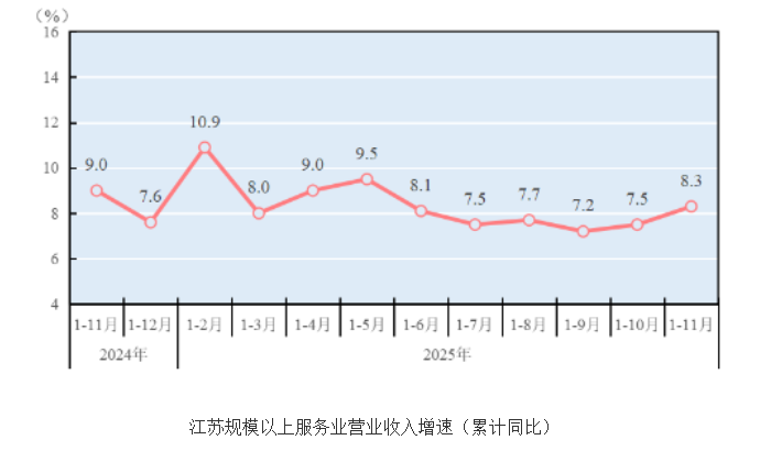 1—11月,全省规上生活性服务业营业收入同比增长5.6%,较1—8月提升1.3个百分点;其中旅游游览和娱乐服务、文化服务、居民出行服务同比分别增长11.1%、11.2%、15.9%。受“苏超”等赛事经济“长尾效应”持续释放影响,体育竞赛组织营业收入同比增长35.7%;居民假日旅游出行热度不减,旅行社及相关服务、旅客票务代理营业收入同比分别增长11.8%、36.4%。