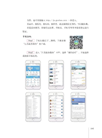 当然,也可直接输入 http://js.guahao.com 一步进入。 页面中,按医院、按疾病、按科室,或直接找医生预约,可以随你挑。 若是首次使用,则需经过注册,将姓名、手机号等基本情况登记进行 验证。 手机访问: Step1 手机扫描以下二维码,下载安装 “江苏政务服务”客户端: Step2 进入“江苏政务服务”APP,选择“预约诊疗”,开始选择 或搜索目标医院: 194 195