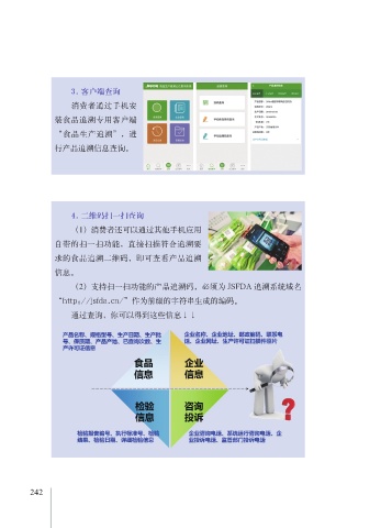 3. 客户端查询 消费者通过手机安 装食品追溯专用客户端 “食品生产追溯”,进 行产品追溯信息查询。 4. 二维码扫一扫查询 (1)消费者还可以通过其他手机应用 自带的扫一扫功能,直接扫描符合追溯要 求的食品追溯二维码,即可查看产品追溯 信息。 (2)支持扫一扫功能的产品追溯码,必须为 JSFDA 追溯系统域名 “http://jsfda.cn/”作为前缀的字符串生成的编码。 通过查询,你可以得到这些信息↓↓ 242 243