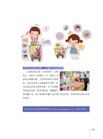 将舌尖安全进行到底,让问题产品无处藏身 追溯系统设置了过期原料、过期 食品、检验不合格原料、出厂检验不合 格食品预警功能。当出现食品安全事故 时,食品安全电子追溯系统可在第一时 间迅速查清食品原料来源、生产控制情 况和食品流向,能更加快速、精确地召 回问题产品,减少或消除问题产品可能产生的危害,有效处置食品安全突 发事件。 请登录江苏省市场监督管理局官网(http://scjgj.jiangsu.gov.cn)了解更多信息。 242 243