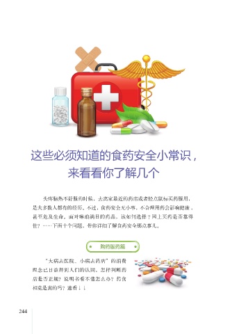 这些必须知道的食药安全小常识 , 来看看你了解几个 头疼脑热不舒服的时候,去离家最近的药店或者轻点鼠标买药服用, 是大多数人都有的经历。不过,食药安全无小事,不合理用药会影响健康 , 甚至危及生命。面对琳琅满目的药品,该如何选择 ? 网上买药是否靠得 住?……下面十个问题,带你详细了解食药安全那点事儿。 购药服药篇 “大病去医院、小病去药店”的消费 理念已日益得到人们的认同。怎样判断药 店是否正规?说明书看不懂怎么办?药食 相克是真的吗?速看↓↓ 244 245