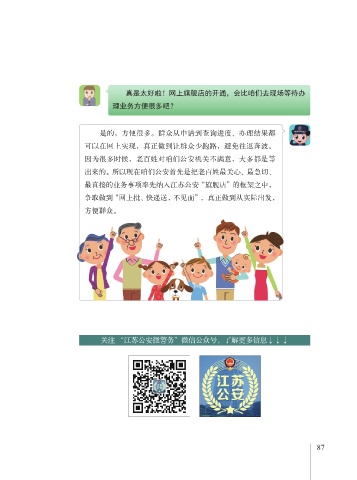 真是太好啦!网上旗舰店的开通,会比咱们去现场等待办 理业务方便很多吧? 是的,方便很多。群众从申请到查询进度、办理结果都 可以在网上实现,真正做到让群众少跑路,避免往返奔波。 因为很多时候,老百姓对咱们公安机关不满意,大多都是等 出来的。所以现在咱们公安首先是把老百姓最关心、最急切、 最直接的业务事项率先纳入江苏公安“旗舰店”的框架之中, 争取做到“网上批、快递送,不见面”, 真正做到从实际出发, 方便群众。方便群众。 关注 “江苏公安微警务”微信公众号,了解更多信息↓↓↓ 86 87