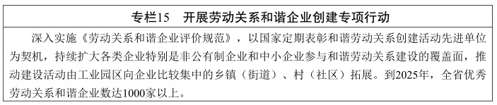 深化和谐劳动关系创建。积极推动企业落实主体责任,开展劳动关系和谐企业创建专项行动,加大劳动关系和谐企业指导培育、评估认定和正向激励力度,加强典型示范和宣传引导,营造构建和谐劳动关系的良好环境。