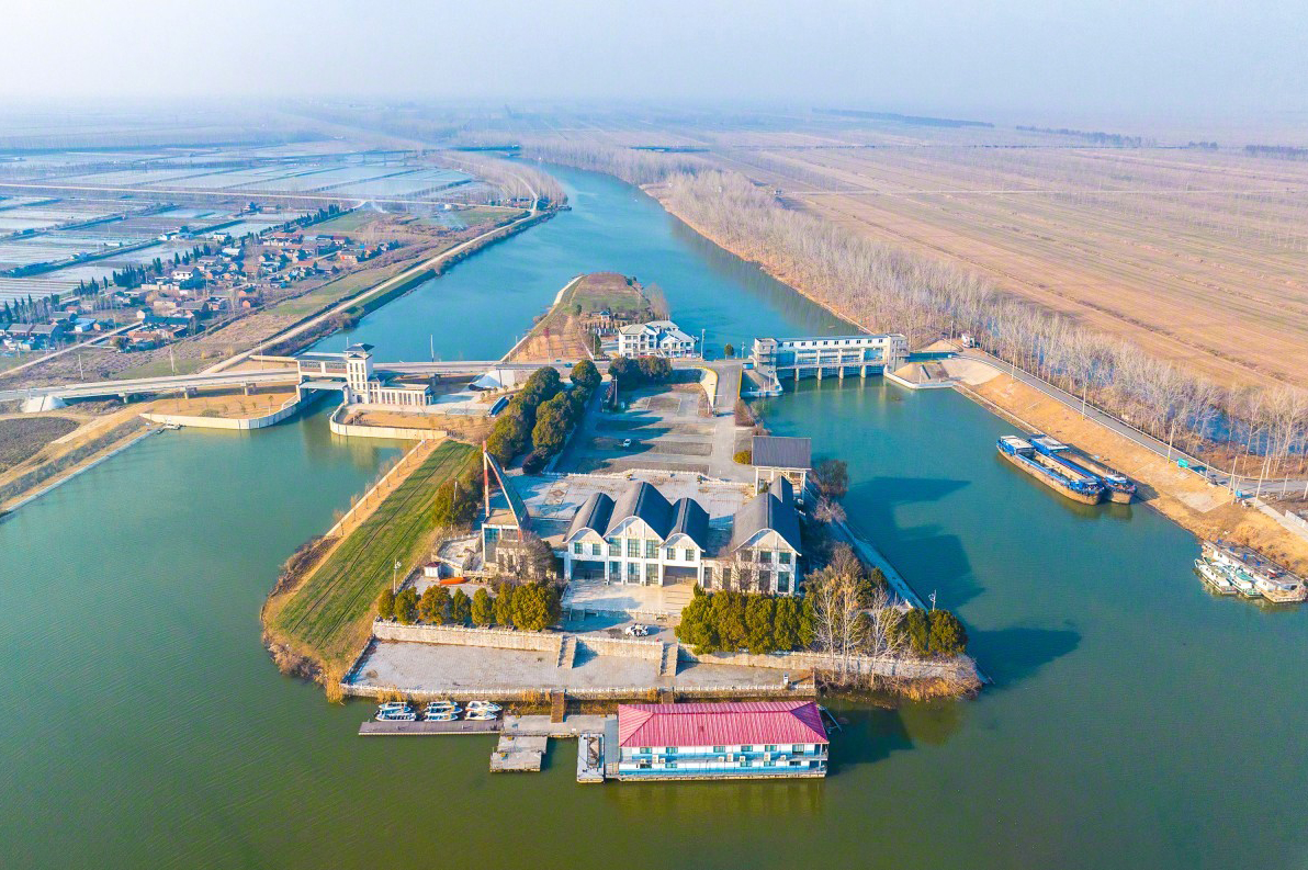 1月28日,泗洪县半城镇濉河节制闸水利枢纽工程天蓝、水碧、景美,宛如画卷。