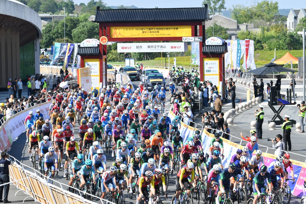 10月9日,2025第十三届环太湖国际公路自行车赛暨长三角穿越赛在位于南京江宁的江苏园博园开赛。来自全球10余个国家和地区的22支顶尖车队、147名职业车手齐聚于山水之间,在96.49公里的园林赛道上展开速度与耐力的对决。邵丹 摄